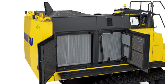 Maintenance points are centrally located, and side and central walkways are provided for easy access. The front engine door also opens wide for easy access to auxiliary equipment. A catwalk is provided as standard on the right side, enabling safe inspections of the cooling area.